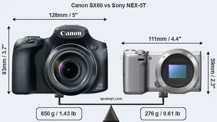 An illustration of the physical size and weight of the Canon SX60 and the Sony NEX-5T is provided in the side-by-side display below. The two cameras are presented according to their relative size. Three consecutive perspectives from the front, the top, and the back are available. All size dimensions are rounded to the nearest millimeter.