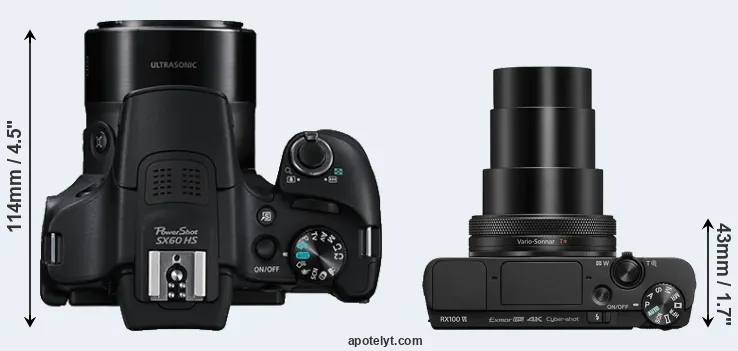 An illustration of the physical size and weight of the Canon SX60 and the Sony RX100 VI is provided in the side-by-side display below. The two cameras are presented according to their relative size. Three consecutive perspectives from the front, the top, and the back are available. All width, height and depth measures are rounded to the nearest millimeter.