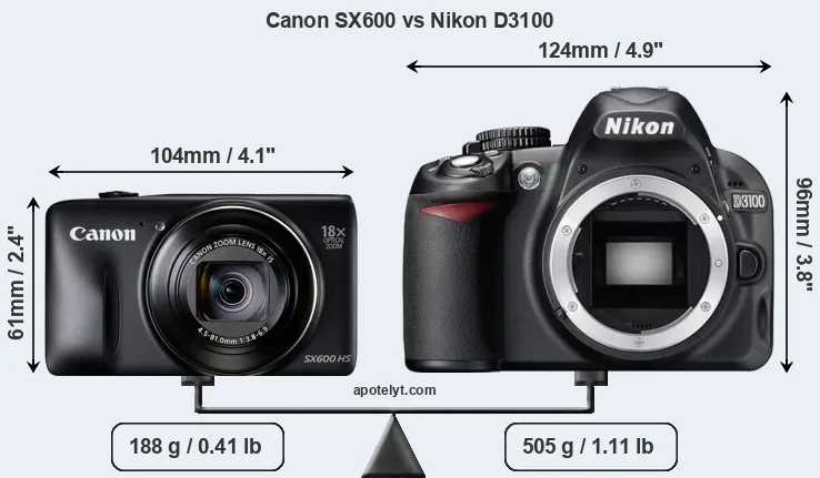 The above size and weight comparisons are to some extent incomplete and possibly misleading, as the SX600 has a lens built in, whereas the D3100 is an interchangeable lens camera that requires a separate lens. Attaching the latter will add extra weight and bulk to the setup. You can compare the optics available for the D3100 and their specifications in the Nikon Lens Catalog.