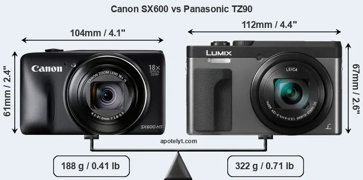 The side-by-side display below illustrates the physical size and weight of the Canon SX600 and the Panasonic TZ90. The two cameras are presented according to their relative size. Three consecutive views from the front, the top, and the rear side are shown. All width, height and depth measures are rounded to the nearest millimeter.
