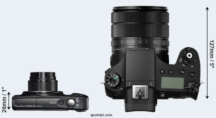 The side-by-side display below illustrates the physical size and weight of the Canon SX600 and the Sony RX10 III. The two cameras are presented according to their relative size. Three successive views from the front, the top, and the rear are shown. All width, height and depth dimensions are rounded to the nearest millimeter.