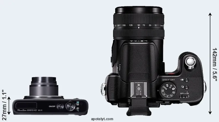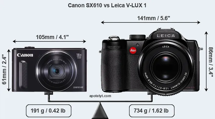 The physical size and weight of the Canon SX610 and the Leica V-LUX 1 are illustrated in the side-by-side display below. The two cameras are presented according to their relative size. Three consecutive perspectives from the front, the top, and the back are available. All width, height and depth measures are rounded to the nearest millimeter.