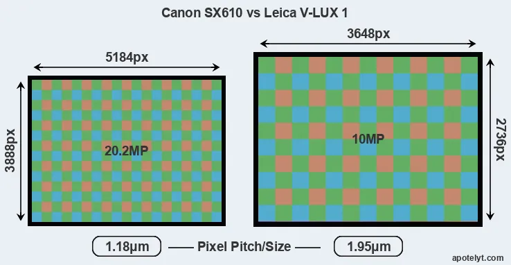 Despite having a smaller sensor, the Canon SX610 offers a higher resolution of 20.2 megapixels, compared with 10 MP of the Leica V-LUX 1. This megapixels advantage comes at the cost of a higher pixel density and a smaller size of the individual pixel (with a pixel pitch of 1.18μm versus 1.95μm for the V-LUX 1). However, it should be noted that the SX610 is much more recent (by 8 years and 3 months) than the V-LUX 1, and its sensor will have benefitted from technological advances during this time that make it possible to gather light more efficiently. Coming back to sensor resolution, it should be mentioned that neither of the two cameras has an anti-alias filter installed, so they are able to capture all the detail the sensor resolves.