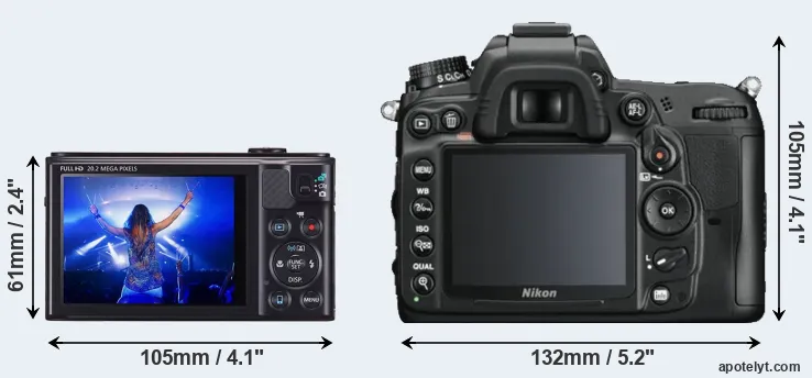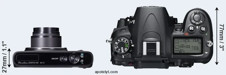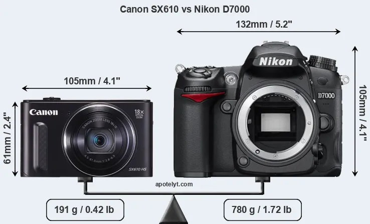 The side-by-side display below illustrates the physical size and weight of the Canon SX610 and the Nikon D7000. The two cameras are presented according to their relative size. Three consecutive perspectives from the front, the top, and the back are available. All width, height and depth measures are rounded to the nearest millimeter.