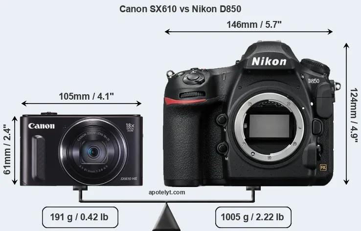 An illustration of the physical size and weight of the Canon SX610 and the Nikon D850 is provided in the side-by-side display below. The two cameras are presented according to their relative size. Three consecutive views from the front, the top, and the rear side are shown. All size dimensions are rounded to the nearest millimeter.