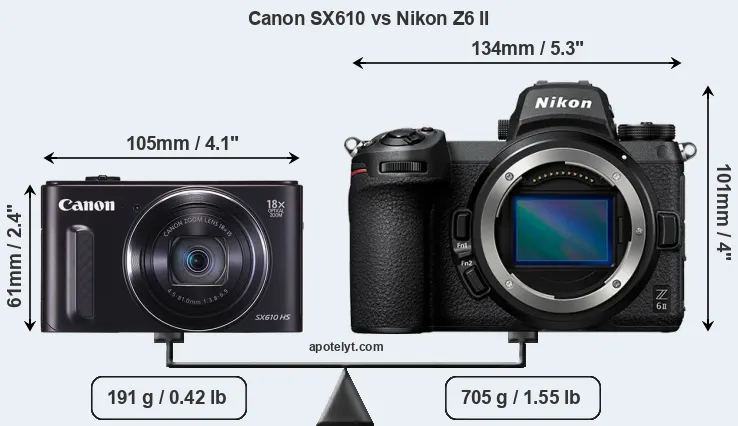 If the front view area (width x height) of the cameras is taken as an aggregate measure of their size, the Nikon Z6 II is considerably larger (111 percent) than the Canon SX610. It is noteworthy in this context that the Z6 II is splash and dust-proof, while the SX610 does not feature any corresponding weather-sealing.