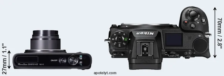 The above size and weight comparisons are to some extent incomplete and possibly misleading, as the SX610 has a lens built in, whereas the Z6 II is an interchangeable lens camera that requires a separate lens. Attaching the latter will add extra weight and bulk to the setup.