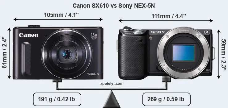 An illustration of the physical size and weight of the Canon SX610 and the Sony NEX-5N is provided in the side-by-side display below. The two cameras are presented according to their relative size. Three successive views from the front, the top, and the rear are shown. All width, height and depth dimensions are rounded to the nearest millimeter.