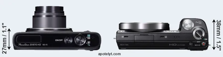 If the front view area (width x height) of the cameras is taken as an aggregate measure of their size, the Sony NEX-5N is somewhat larger (2 percent) than the Canon SX610. In this context, it is worth noting that neither the SX610 nor the NEX-5N are weather-sealed.
