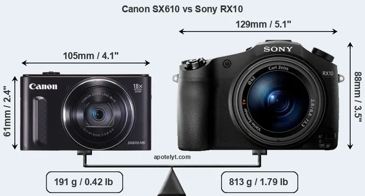 If the front view area (width x height) of the cameras is taken as an aggregate measure of their size, the Sony RX10 is considerably larger (77 percent) than the Canon SX610. Moreover, the RX10 is substantially heavier (326 percent) than the SX610. It is noteworthy in this context that the RX10 is splash and dust-proof, while the SX610 does not feature any corresponding weather-sealing.