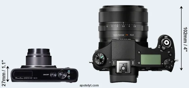 An illustration of the physical size and weight of the Canon SX610 and the Sony RX10 is provided in the side-by-side display below. The two cameras are presented according to their relative size. Three consecutive perspectives from the front, the top, and the back are available. All size dimensions are rounded to the nearest millimeter.