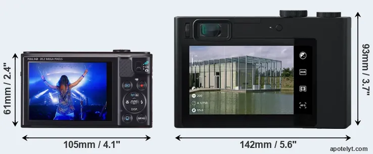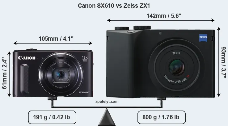 If the front view area (width x height) of the cameras is taken as an aggregate measure of their size, the Zeiss ZX1 is considerably larger (106 percent) than the Canon SX610. Moreover, the ZX1 is substantially heavier (319 percent) than the SX610. In this context, it is worth noting that neither the SX610 nor the ZX1 are weather-sealed.