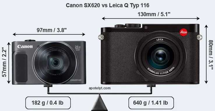 If the front view area (width x height) of the cameras is taken as an aggregate measure of their size, the Leica Q Typ 116 is considerably larger (88 percent) than the Canon SX620. Moreover, the Q Typ 116 is substantially heavier (252 percent) than the SX620. In this context, it is worth noting that neither the SX620 nor the Q Typ 116 are weather-sealed.
