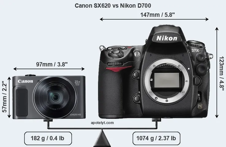 The physical size and weight of the Canon SX620 and the Nikon D700 are illustrated in the side-by-side display below. The two cameras are presented according to their relative size. Three successive views from the front, the top, and the rear are shown. All width, height and depth measures are rounded to the nearest millimeter.