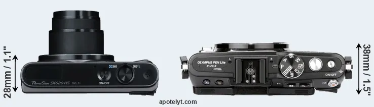The above size and weight comparisons are to some extent incomplete and possibly misleading, as the SX620 has a lens built in, whereas the E-PL5 is an interchangeable lens camera that requires a separate lens. Attaching the latter will add extra weight and bulk to the setup. You can compare the optics available for the E-PL5 and their specifications in the Micro Four Thirds Lens Catalog.
