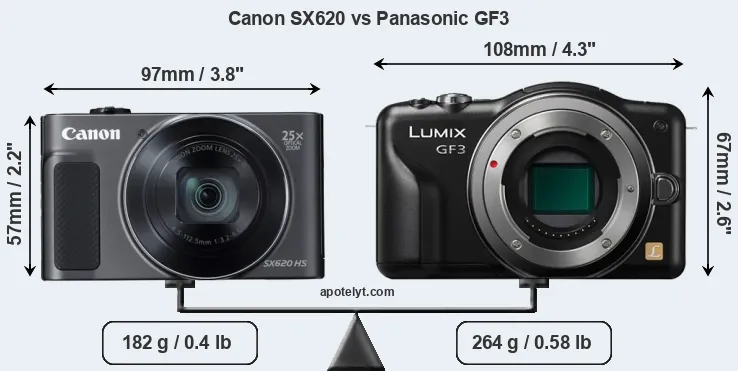 The physical size and weight of the Canon SX620 and the Panasonic GF3 are illustrated in the side-by-side display below. The two cameras are presented according to their relative size. Three successive views from the front, the top, and the rear are shown. All width, height and depth measures are rounded to the nearest millimeter.