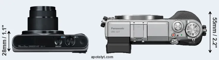 If the front view area (width x height) of the cameras is taken as an aggregate measure of their size, the Panasonic GX7 is considerably larger (58 percent) than the Canon SX620. In this context, it is worth noting that neither the SX620 nor the GX7 are weather-sealed.