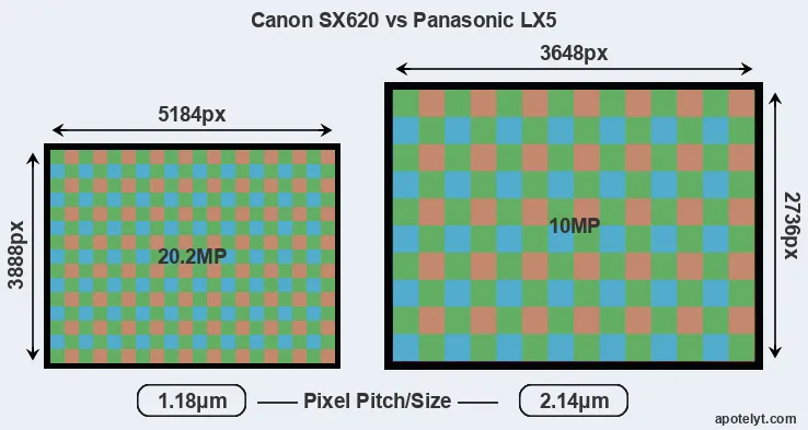 Despite having a smaller sensor, the Canon SX620 offers a higher resolution of 20.2 megapixels, compared with 10 MP of the Panasonic LX5. This megapixels advantage comes at the cost of a higher pixel density and a smaller size of the individual pixel (with a pixel pitch of 1.18μm versus 2.14μm for the LX5). However, it should be noted that the SX620 is much more recent (by 5 years and 9 months) than the LX5, and its sensor will have benefitted from technological advances during this time that make it possible to gather light more efficiently. Coming back to sensor resolution, it should be mentioned that the SX620 has no anti-alias filter installed, so that it can capture all the detail its sensor resolves.