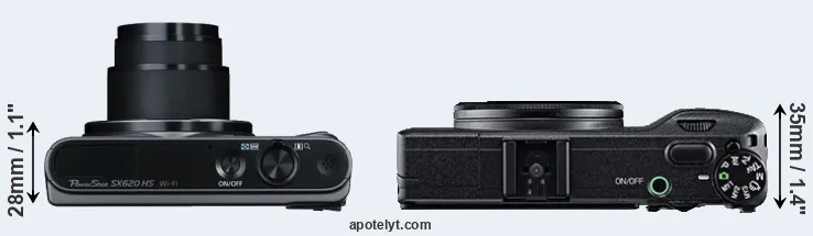 The side-by-side display below illustrates the physical size and weight of the Canon SX620 and the Ricoh GR. The two cameras are presented according to their relative size. Three consecutive views from the front, the top, and the rear side are shown. All width, height and depth dimensions are rounded to the nearest millimeter.