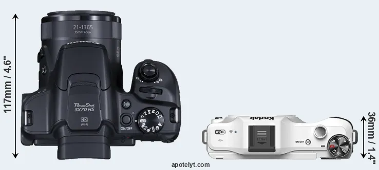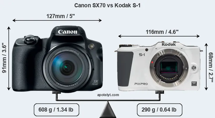 The physical size and weight of the Canon SX70 and the Kodak S-1 are illustrated in the side-by-side display below. The two cameras are presented according to their relative size. Three consecutive perspectives from the front, the top, and the back are available. All width, height and depth measures are rounded to the nearest millimeter.