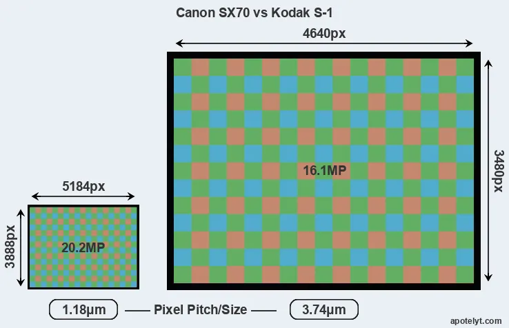 Despite having a smaller sensor, the Canon SX70 offers a higher resolution of 20.2 megapixels, compared with 16.1 MP of the Kodak S-1. This megapixels advantage comes at the cost of a higher pixel density and a smaller size of the individual pixel (with a pixel pitch of 1.18μm versus 3.74μm for the S-1). However, it should be noted that the SX70 is much more recent (by 6 years and 8 months) than the S-1, and its sensor will have benefitted from technological advances during this time that make it possible to gather light more efficiently. Coming back to sensor resolution, it should be mentioned that the SX70 has no anti-alias filter installed, so that it can capture all the detail its sensor resolves.