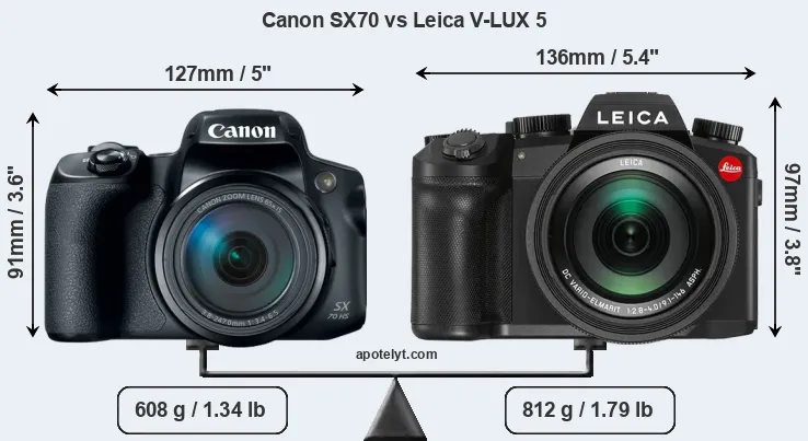 The physical size and weight of the Canon SX70 and the Leica V-LUX 5 are illustrated in the side-by-side display below. The two cameras are presented according to their relative size. Three successive views from the front, the top, and the rear are shown. All width, height and depth measures are rounded to the nearest millimeter.