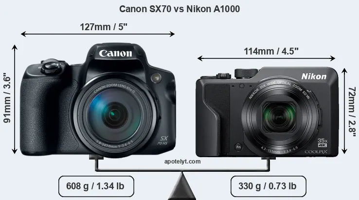 The side-by-side display below illustrates the physical size and weight of the Canon SX70 and the Nikon A1000. The two cameras are presented according to their relative size. Three successive views from the front, the top, and the rear are shown. All width, height and depth measures are rounded to the nearest millimeter.