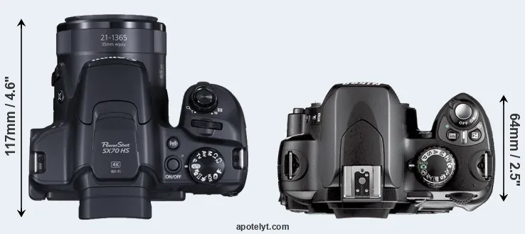 The side-by-side display below illustrates the physical size and weight of the Canon SX70 and the Nikon D40X. The two cameras are presented according to their relative size. Three consecutive views from the front, the top, and the rear side are shown. All width, height and depth dimensions are rounded to the nearest millimeter.