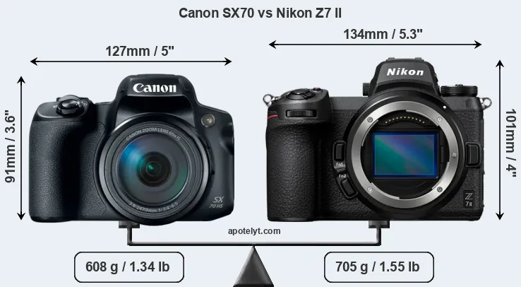 An illustration of the physical size and weight of the Canon SX70 and the Nikon Z7 II is provided in the side-by-side display below. The two cameras are presented according to their relative size. Three successive views from the front, the top, and the rear are shown. All width, height and depth dimensions are rounded to the nearest millimeter.