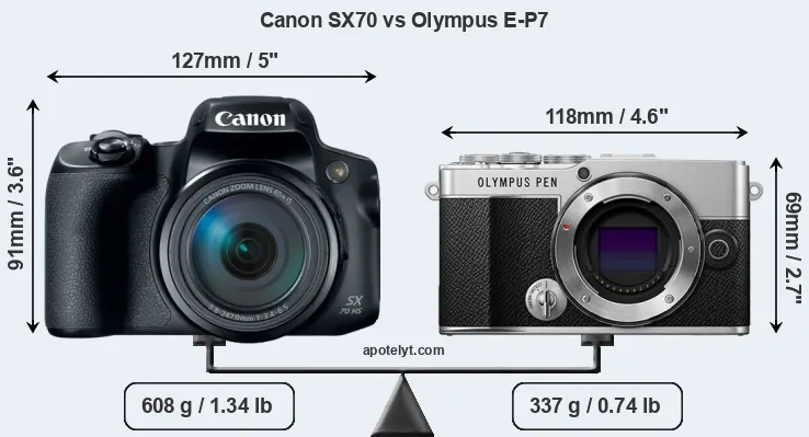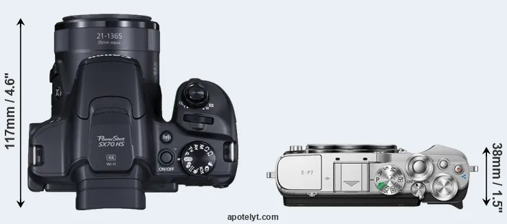 The side-by-side display below illustrates the physical size and weight of the Canon SX70 and the Olympus E-P7. The two cameras are presented according to their relative size. Three consecutive perspectives from the front, the top, and the back are available. All width, height and depth measures are rounded to the nearest millimeter.