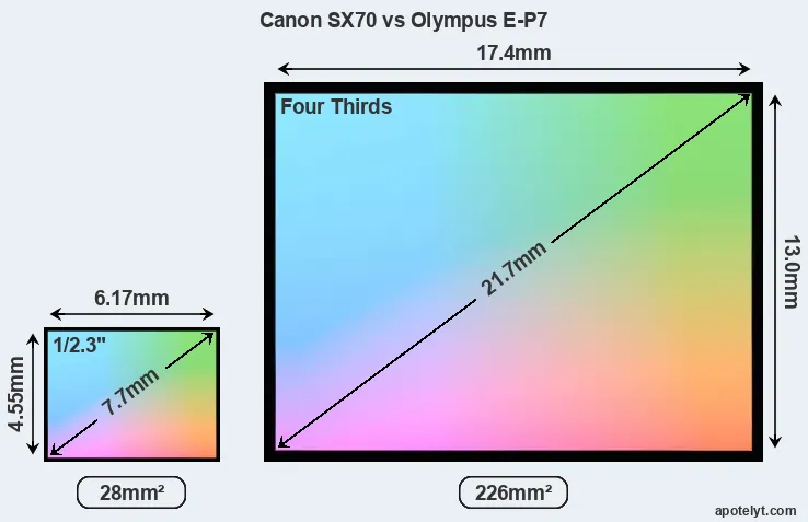 Of the two cameras under consideration, the Canon SX70 features a 1/2.3-inch sensor and the Olympus E-P7 a Four Thirds sensor. The sensor area in the E-P7 is 707 percent bigger. As a result of these sensor size differences, the cameras have a format factor of, respectively, 5.6 and 2.0. Both cameras feature a native aspect ratio (sensor width to sensor height) of 4:3.