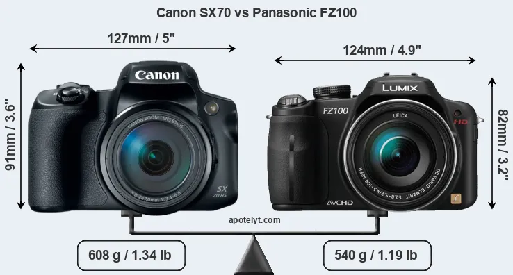 An illustration of the physical size and weight of the Canon SX70 and the Panasonic FZ100 is provided in the side-by-side display below. The two cameras are presented according to their relative size. Three consecutive perspectives from the front, the top, and the back are available. All size dimensions are rounded to the nearest millimeter.