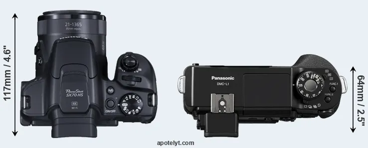 An illustration of the physical size and weight of the Canon SX70 and the Panasonic L1 is provided in the side-by-side display below. The two cameras are presented according to their relative size. Three consecutive views from the front, the top, and the rear side are shown. All width, height and depth dimensions are rounded to the nearest millimeter.