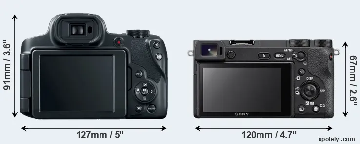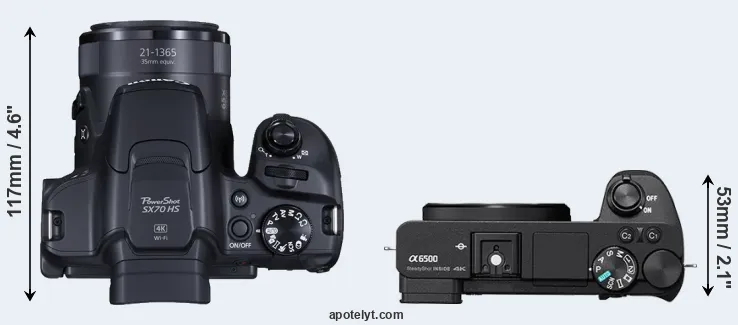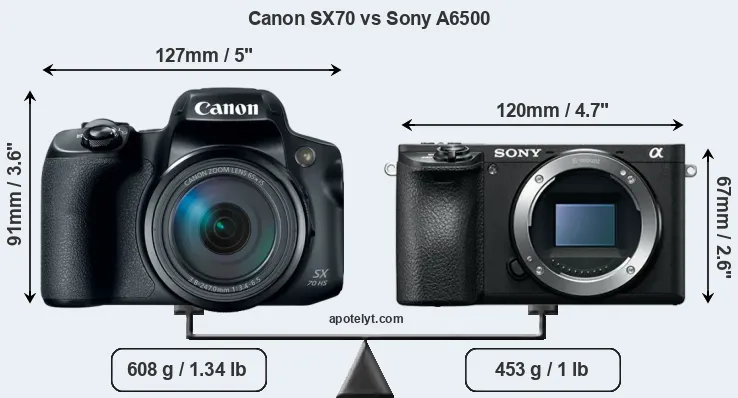 The side-by-side display below illustrates the physical size and weight of the Canon SX70 and the Sony A6500. The two cameras are presented according to their relative size. Three consecutive perspectives from the front, the top, and the back are available. All width, height and depth dimensions are rounded to the nearest millimeter.