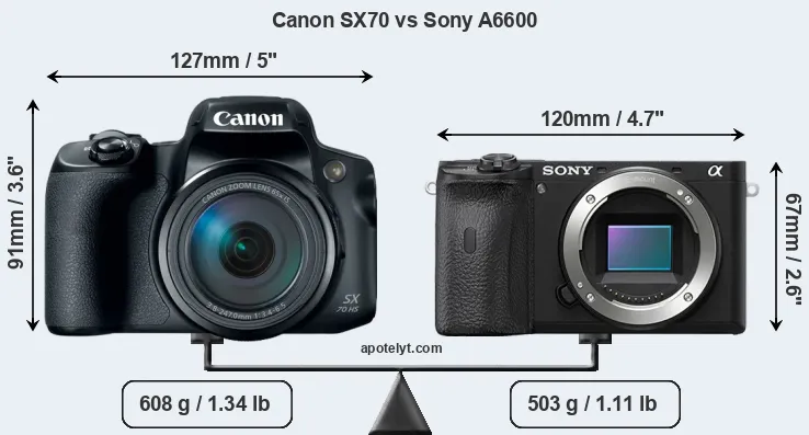 The side-by-side display below illustrates the physical size and weight of the Canon SX70 and the Sony A6600. The two cameras are presented according to their relative size. Three consecutive perspectives from the front, the top, and the back are available. All width, height and depth dimensions are rounded to the nearest millimeter.