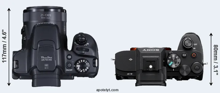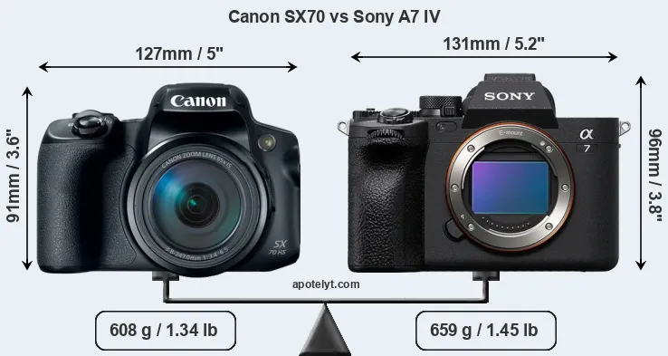 The side-by-side display below illustrates the physical size and weight of the Canon SX70 and the Sony A7 IV. The two cameras are presented according to their relative size. Three consecutive perspectives from the front, the top, and the back are available. All width, height and depth measures are rounded to the nearest millimeter.