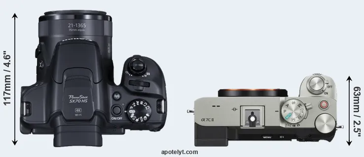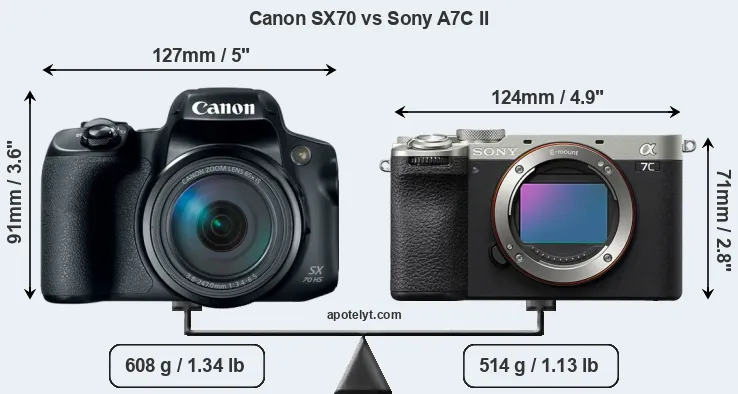 If the front view area (width x height) of the cameras is taken as an aggregate measure of their size, the Sony A7C II is notably smaller (24 percent) than the Canon SX70. It is noteworthy in this context that the A7C II is splash and dust-proof, while the SX70 does not feature any corresponding weather-sealing.