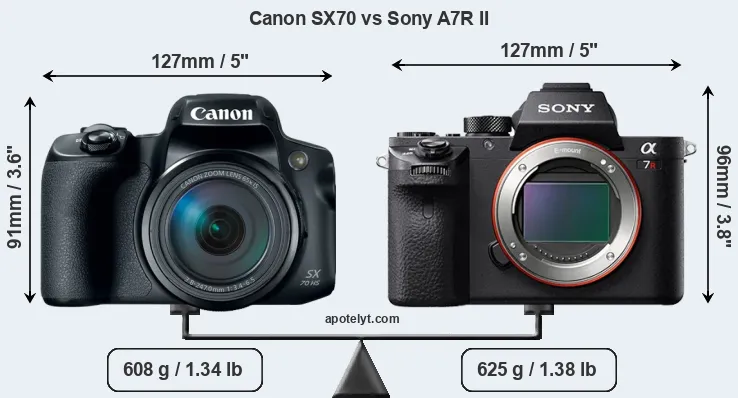 The side-by-side display below illustrates the physical size and weight of the Canon SX70 and the Sony A7R II. The two cameras are presented according to their relative size. Three successive views from the front, the top, and the rear are shown. All width, height and depth dimensions are rounded to the nearest millimeter.