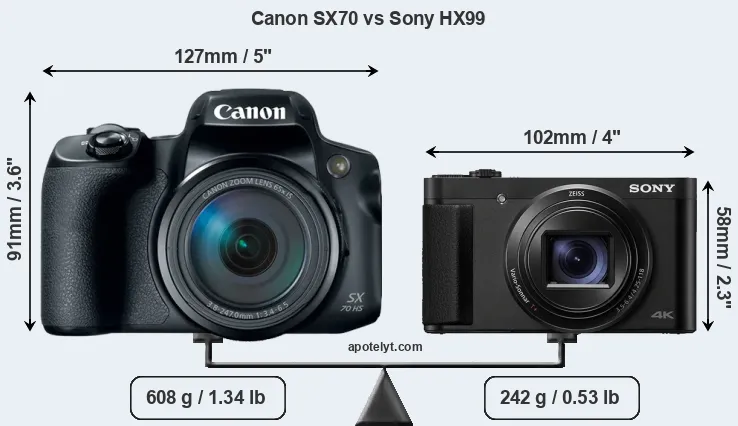 If the front view area (width x height) of the cameras is taken as an aggregate measure of their size, the Sony HX99 is considerably smaller (49 percent) than the Canon SX70. Moreover, the HX99 is substantially lighter (60 percent) than the SX70. In this context, it is worth noting that neither the SX70 nor the HX99 are weather-sealed.