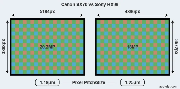 While the two cameras under review share the same sensor size, the SX70 offers a higher resolution of 20.2 megapixels, compared with 18 MP of the HX99. This megapixels advantage translates into a 6 percent gain in linear resolution. On the other hand, these sensor specs imply that the SX70 has a higher pixel density and a smaller size of the individual pixel (with a pixel pitch of 1.18μm versus 1.25μm for the HX99). It is noteworthy in this context that the two cameras were released in close succession, so that their sensors are from the same technological generation. Coming back to sensor resolution, it should be mentioned that neither of the two cameras has an anti-alias filter installed, so they are able to capture all the detail the sensor resolves.