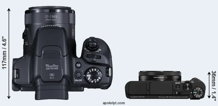 The physical size and weight of the Canon SX70 and the Sony HX99 are illustrated in the side-by-side display below. The two cameras are presented according to their relative size. Three successive views from the front, the top, and the rear are shown. All width, height and depth measures are rounded to the nearest millimeter.