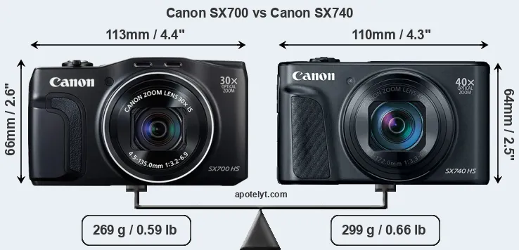 An illustration of the physical size and weight of the Canon SX700 and the Canon SX740 is provided in the side-by-side display below. The two cameras are presented according to their relative size. Three successive views from the front, the top, and the rear are shown. All width, height and depth dimensions are rounded to the nearest millimeter.