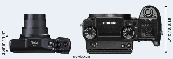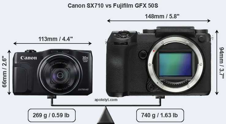 An illustration of the physical size and weight of the Canon SX710 and the Fujifilm GFX 50S is provided in the side-by-side display below. The two cameras are presented according to their relative size. Three consecutive perspectives from the front, the top, and the back are available. All width, height and depth dimensions are rounded to the nearest millimeter.