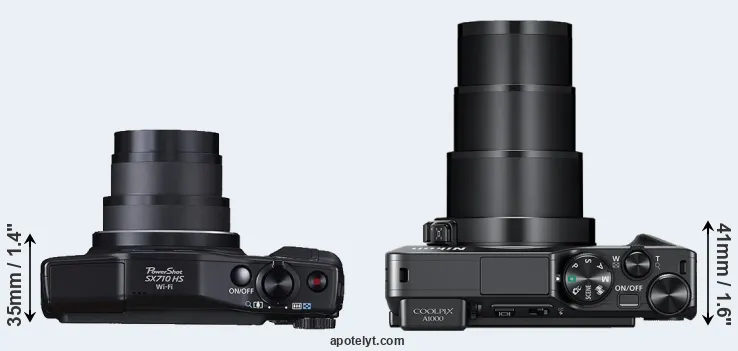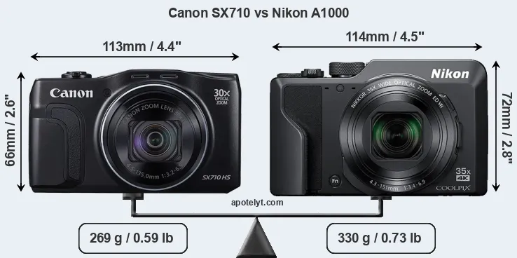 The physical size and weight of the Canon SX710 and the Nikon A1000 are illustrated in the side-by-side display below. The two cameras are presented according to their relative size. Three consecutive perspectives from the front, the top, and the back are available. All size dimensions are rounded to the nearest millimeter.