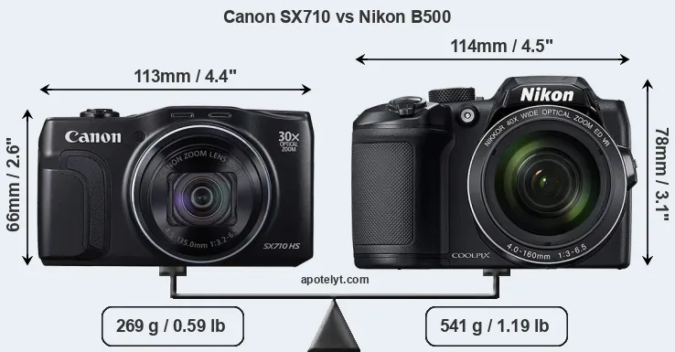 The side-by-side display below illustrates the physical size and weight of the Canon SX710 and the Nikon B500. The two cameras are presented according to their relative size. Three consecutive views from the front, the top, and the rear side are shown. All width, height and depth dimensions are rounded to the nearest millimeter.