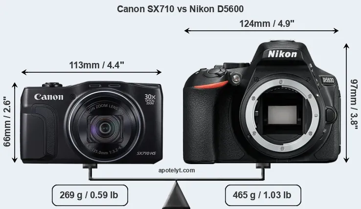 An illustration of the physical size and weight of the Canon SX710 and the Nikon D5600 is provided in the side-by-side display below. The two cameras are presented according to their relative size. Three consecutive perspectives from the front, the top, and the back are available. All size dimensions are rounded to the nearest millimeter.