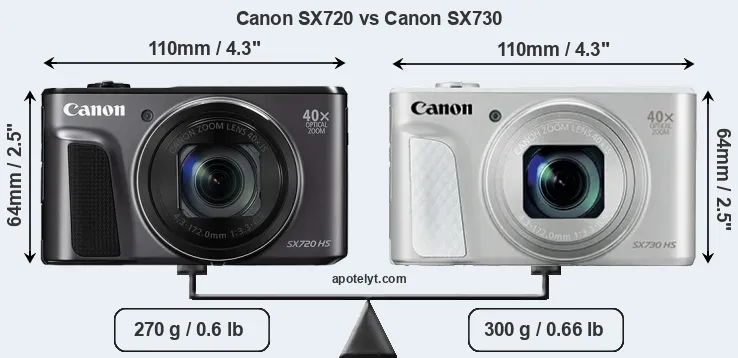 An illustration of the physical size and weight of the Canon SX720 and the Canon SX730 is provided in the side-by-side display below. The two cameras are presented according to their relative size. Three consecutive perspectives from the front, the top, and the back are available. All width, height and depth measures are rounded to the nearest millimeter.