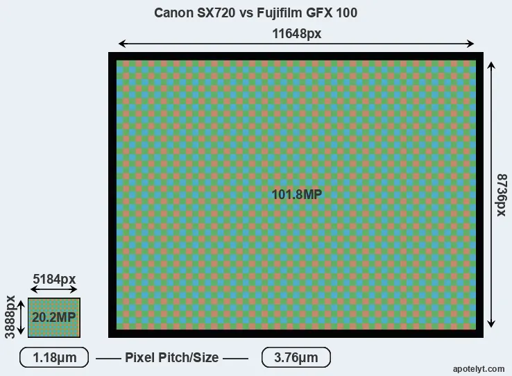 | Sensor Specs | Canon SX720 | Fujifilm GFX 100 |