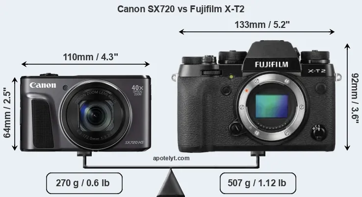 If the front view area (width x height) of the cameras is taken as an aggregate measure of their size, the Fujifilm X-T2 is considerably larger (74 percent) than the Canon SX720. It is noteworthy in this context that the X-T2 is splash and dust-proof, while the SX720 does not feature any corresponding weather-sealing.