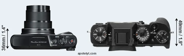 The physical size and weight of the Canon SX720 and the Fujifilm X-T2 are illustrated in the side-by-side display below. The two cameras are presented according to their relative size. Three consecutive views from the front, the top, and the rear side are shown. All width, height and depth dimensions are rounded to the nearest millimeter.